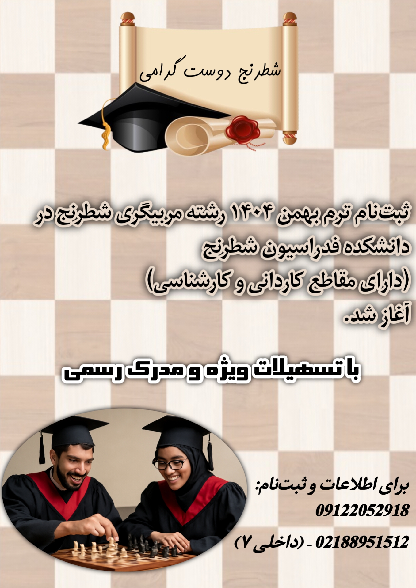 ثبت نام ترم بهمن ۱۴۰۴ رشته مربیگری شطرنج در دانشکده فدراسیون شطرنج دارای مقاطع کاردانی و کارشناسی آغاز شد.